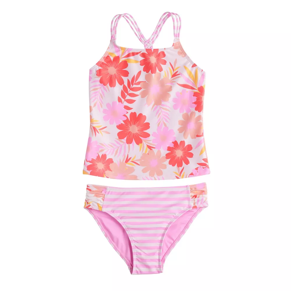 She’ll love the cute look of this girls’ SO Twin Print Tankini Top & Bottoms Swimsuit Set.