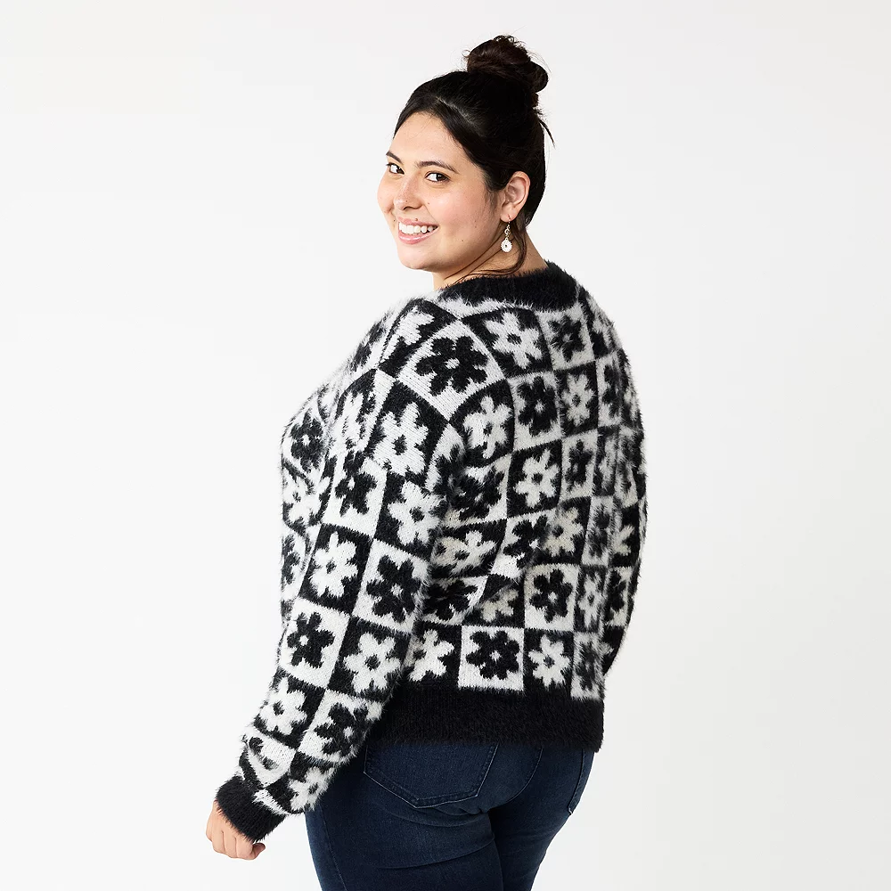 Stay comfy and cozy (but still stylish) in this juniors’ fuzzy cropped sweater from SO.