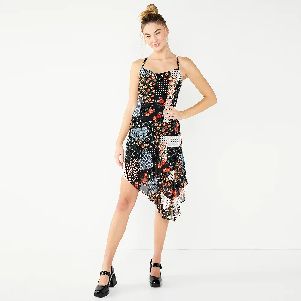 Stay cute and in-style with this juniors’ cascading patchwork dress from SO.