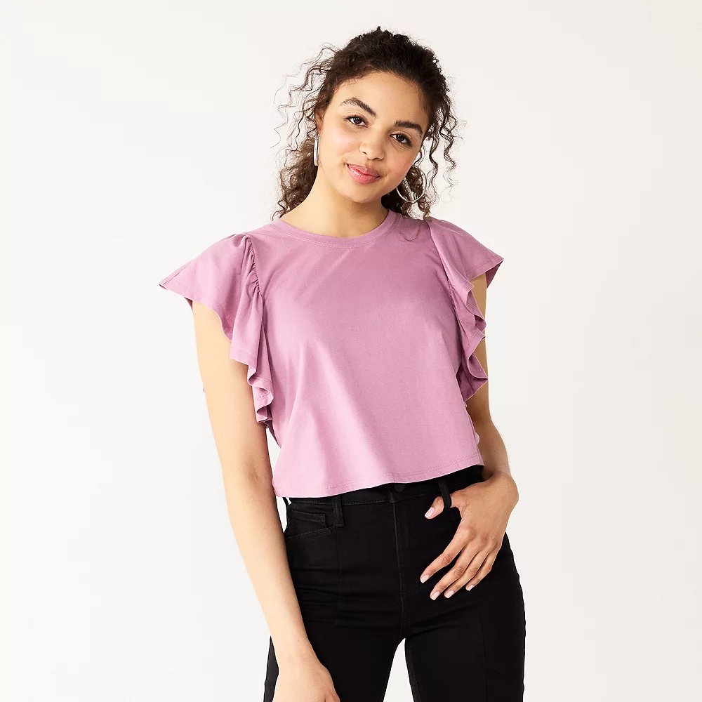 Delicate flutter sleeves elevate this already adorable cropped juniors’ tee from SO.