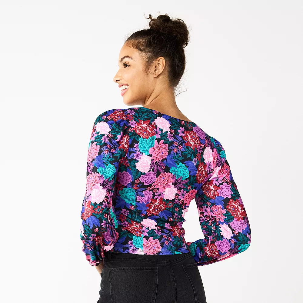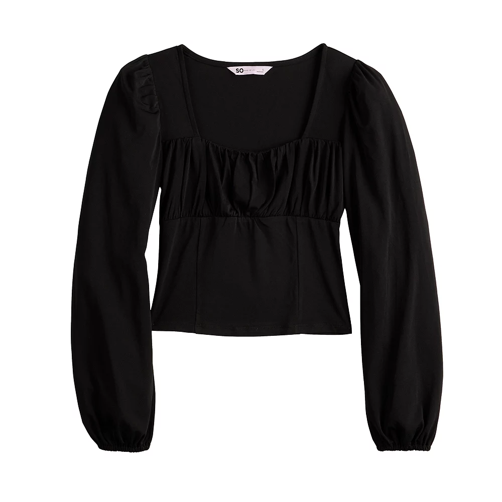 This juniors’ SO shirt has a cropped silhouette and adorable ruching at the bust, you’re sure to arrive in style.