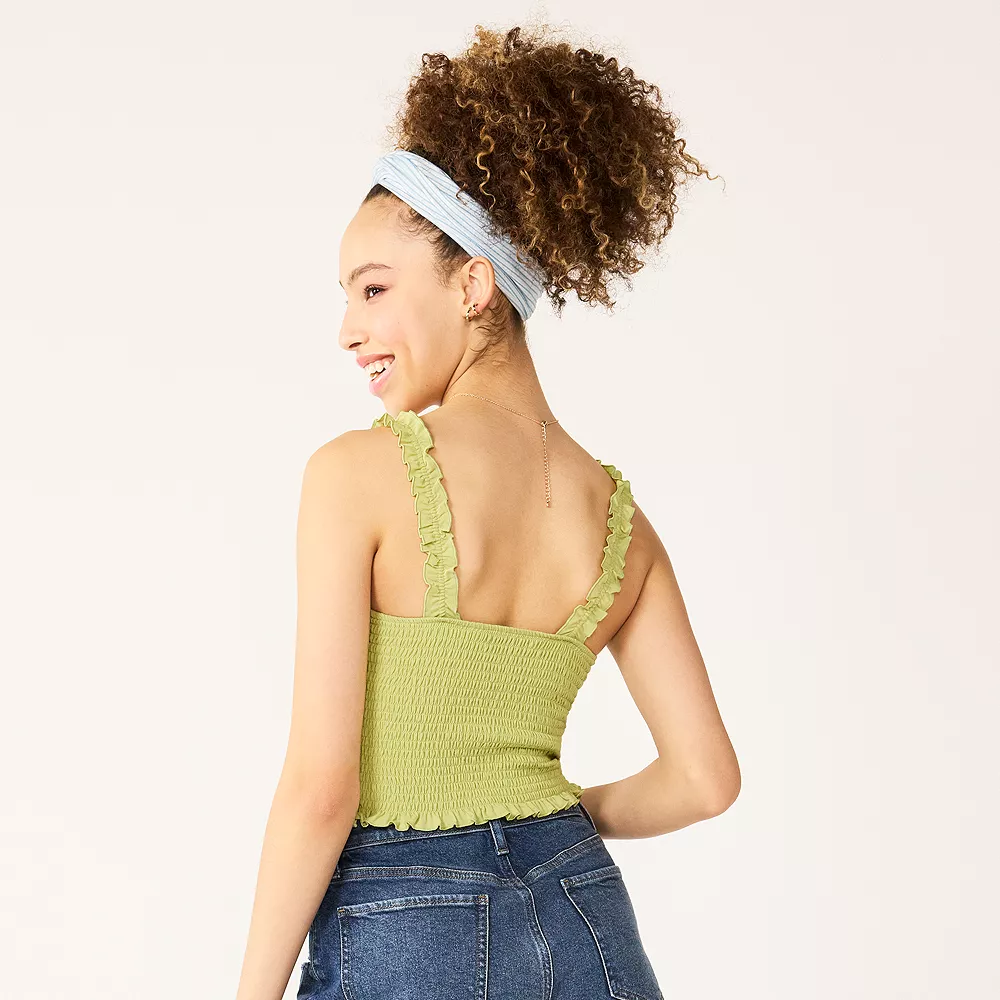 A lovely look. Turn on the charm in this juniors’ ruffled shoulder smocked tank top from SO.